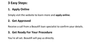 Apply online and get-prequalified in minutes! Beautifi can approve your loan and finance your procedure in less than 24hrs.